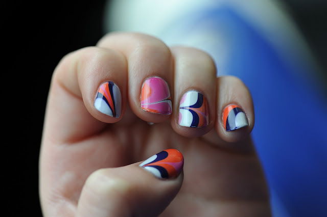 For the water marble I used: OPI's My Boyfriend Scales Walls, Essie's No More Film, Nyx Girls' Bloody Mary, and China Glaze's Oh How Street It Is :). On my other hand I used the same colours, except instead of Bloody Mary I used Essie's Mod Square (because Bloody Mary looked pink after spreading out on the water)!