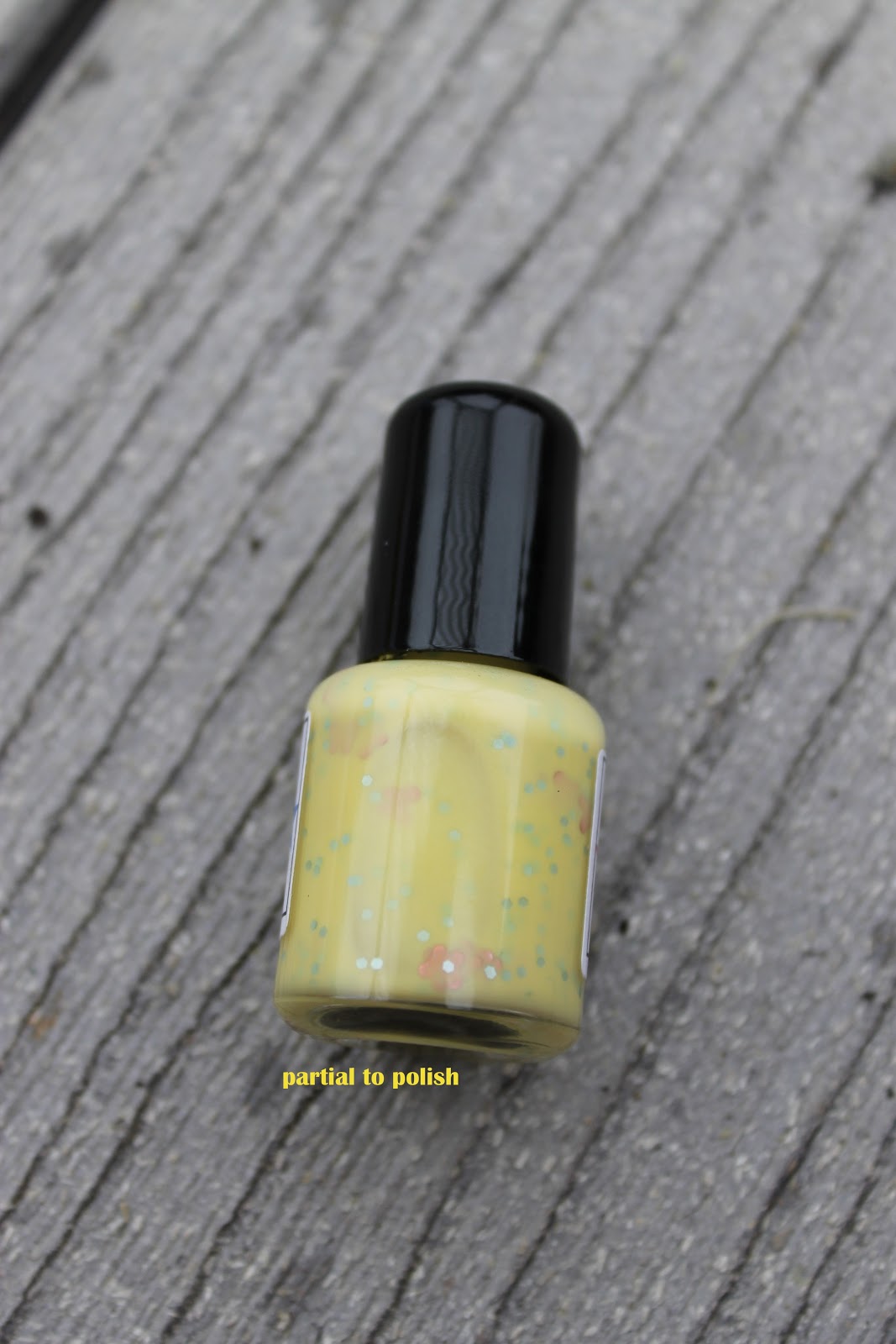 Juicy Contradiction is a pale-ish yellow jelly with very tiny round red glitters, and tiny round orange glitters. This polish seemed the most sheer out of the three coloured polishes I bought, but I used the thinnest coats with this polish. I used three coats in the swatches you see here =).