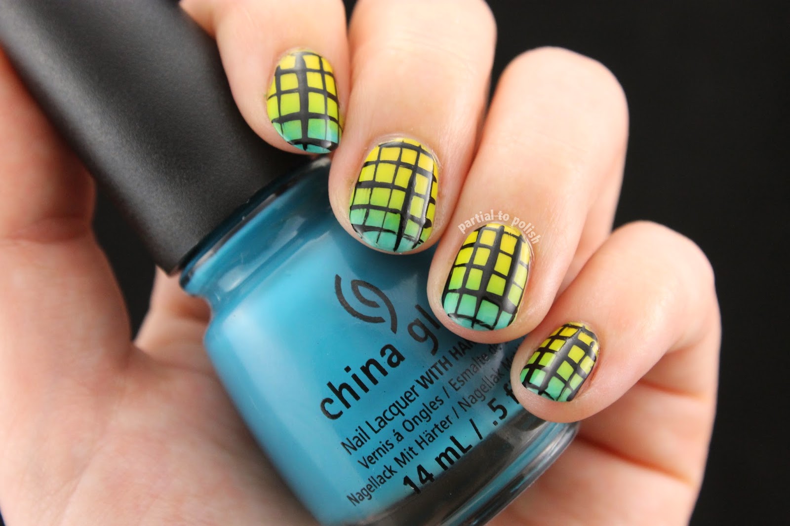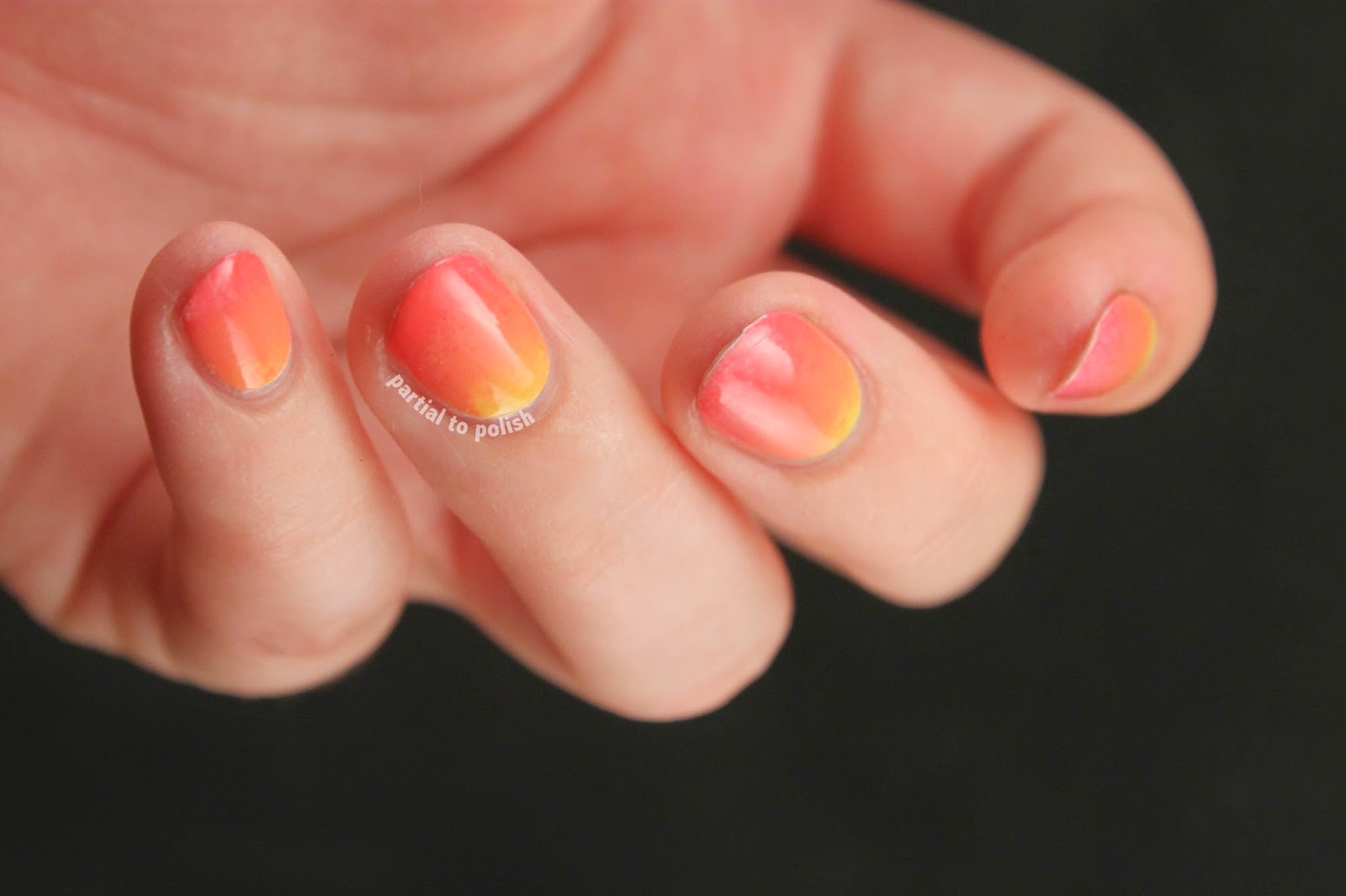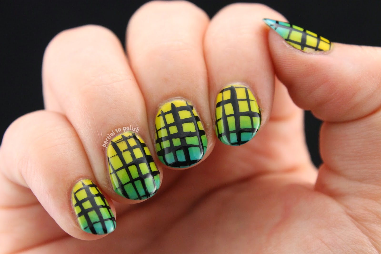 Next, I went in with a damp makeup sponge and American Apparel Sunshine State (yellow), American Apparel Cresent Heights (chartreuse) and China Glaze Wait N Sea (blue)! I sponged on two to three layers to get the opacity I wanted.