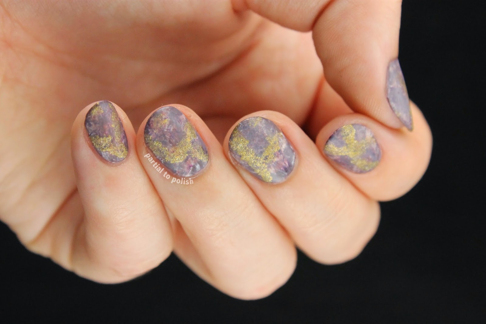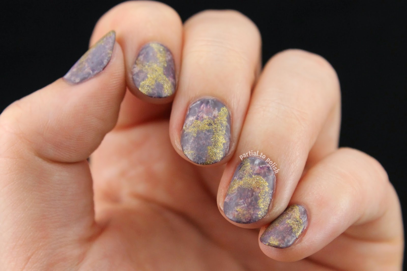 I decided to add a coat of a sheer white polish (Essie Waltz) to calm down/blend the colours and design a bit. After that, I painted on some gold veins with Milani 3D Holographic Nail Lacquer in 3D and my Winstonia Kolinsky Sable Brush in #0000.