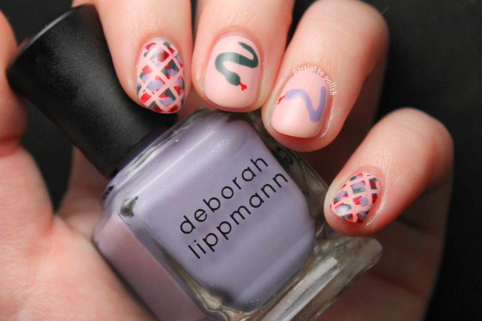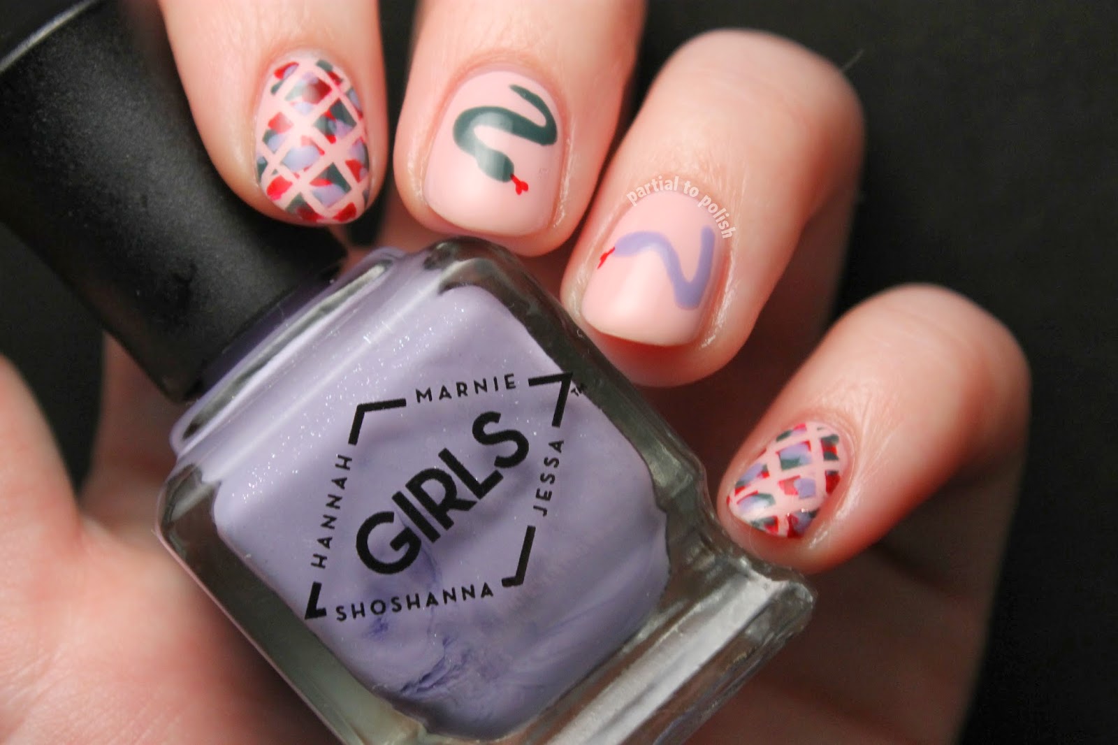 I started off with two coats of OPI My Dogsled is a Hybrid, OPI Good Grief! or American Apparel French Lilac on most of my nails. I then went in with each of those colours on a small paint brush for the accent nails.