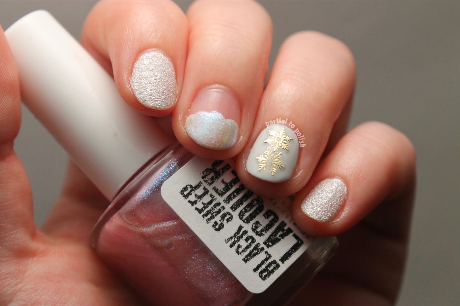 I started off with one coat of the base coat I've been using recently (Orly Bonder) and then to most of my nails I applied two coats of a lovely texture polish, OPI Solitaire. For my snow-capped nails I just used a small detailing brush (Winstonia Kolinsky Sable Brush in #000) for the white part (done with OPI My Boyfriend Scales Walls) and Black Sheep Lacquer Blink straight from the bottle for the duochrome topper. For my remaining nails I applied two coats of MBSW and while the second one was still wet I applied the snowflake charms (number 8 of these, though I seemed to have a 9 thrown in as you can see in these pictures).